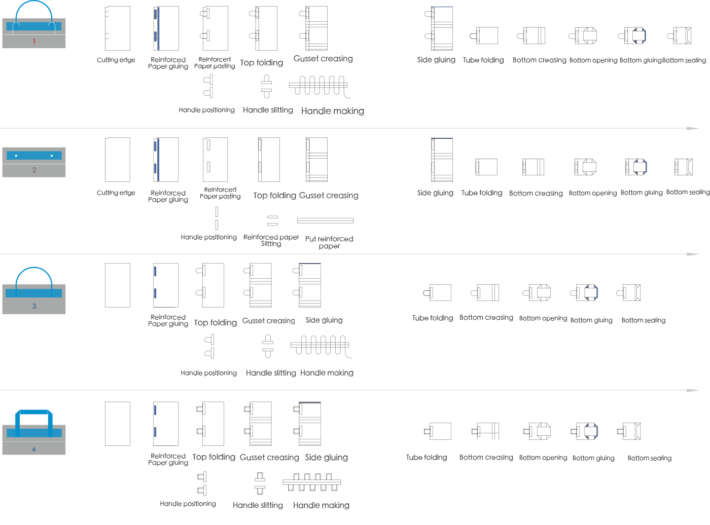 1.Paper handle making、handle pasting、top folding、tube forming、gusset forming、 square bottom open、bottom gluing、bottom pasting、compaction output. 2.Paper handle making、handle pasting(without top folding)、tube forming、gusset forming、 square bottom open、bottom gluing、bottom pasting、compaction output.3. Reinforce card making、reinforce card pasting、top folding、tube forming、gusset forming、 hole punching、square bottom open、bottom gluing、bottom pasting、compaction output.